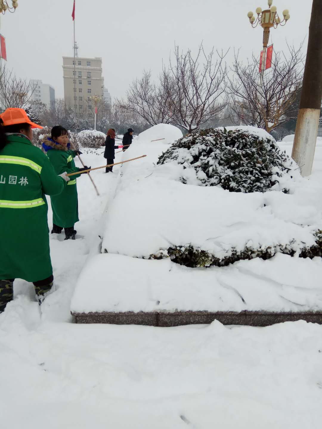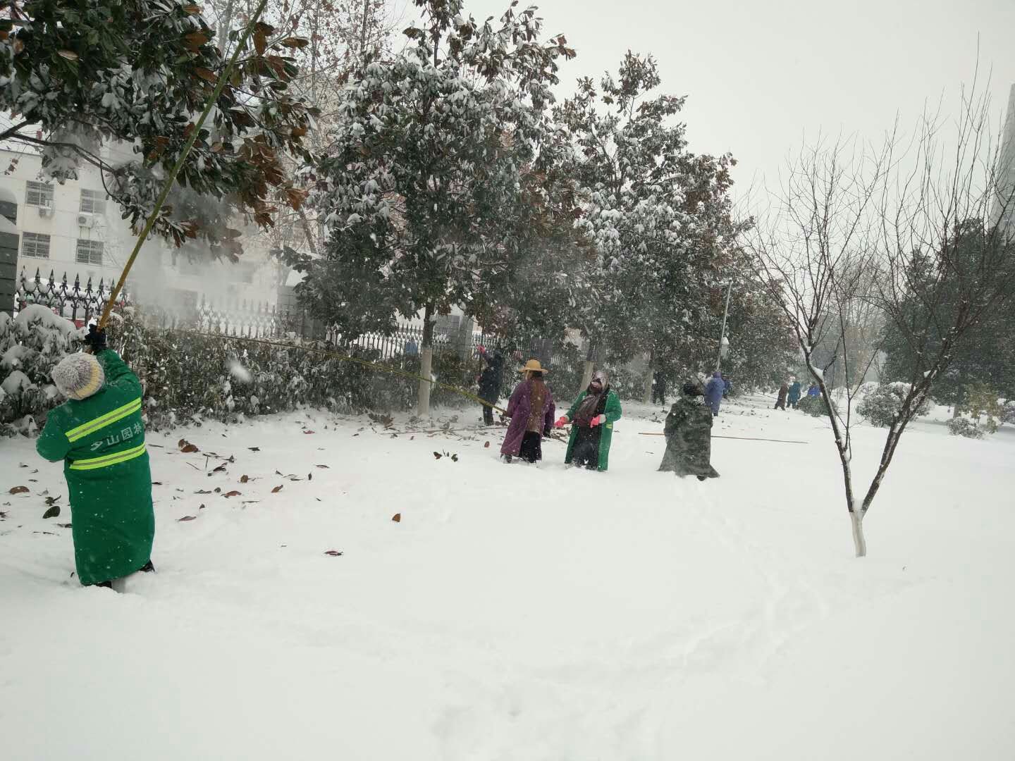 大雪仍在继续,险情不容怠慢。我们全体干部职工放弃休息时间,下午一点半又开始奋战在城区主干道、行政中心及其它受灾比较严重的路段清理护绿。