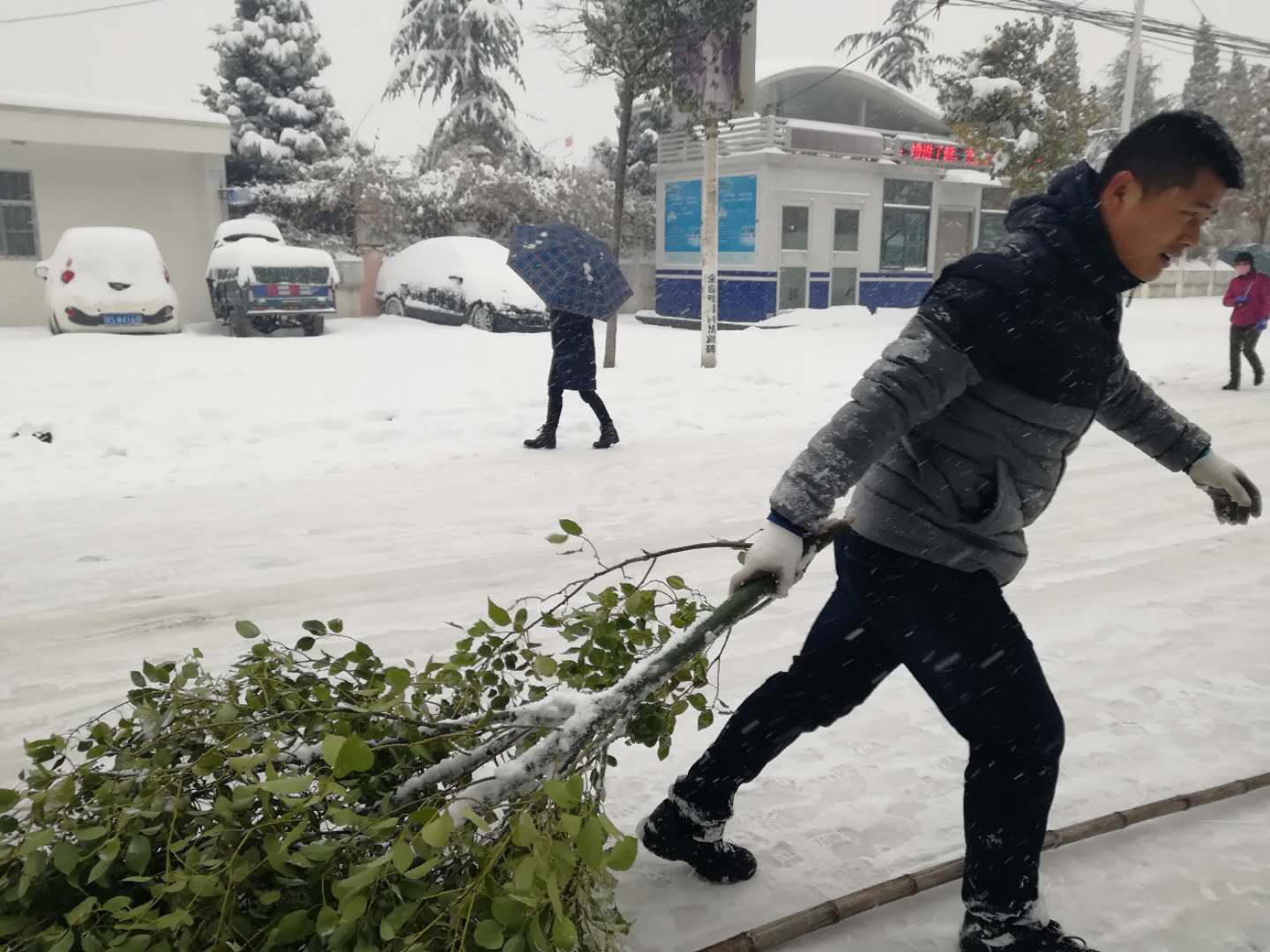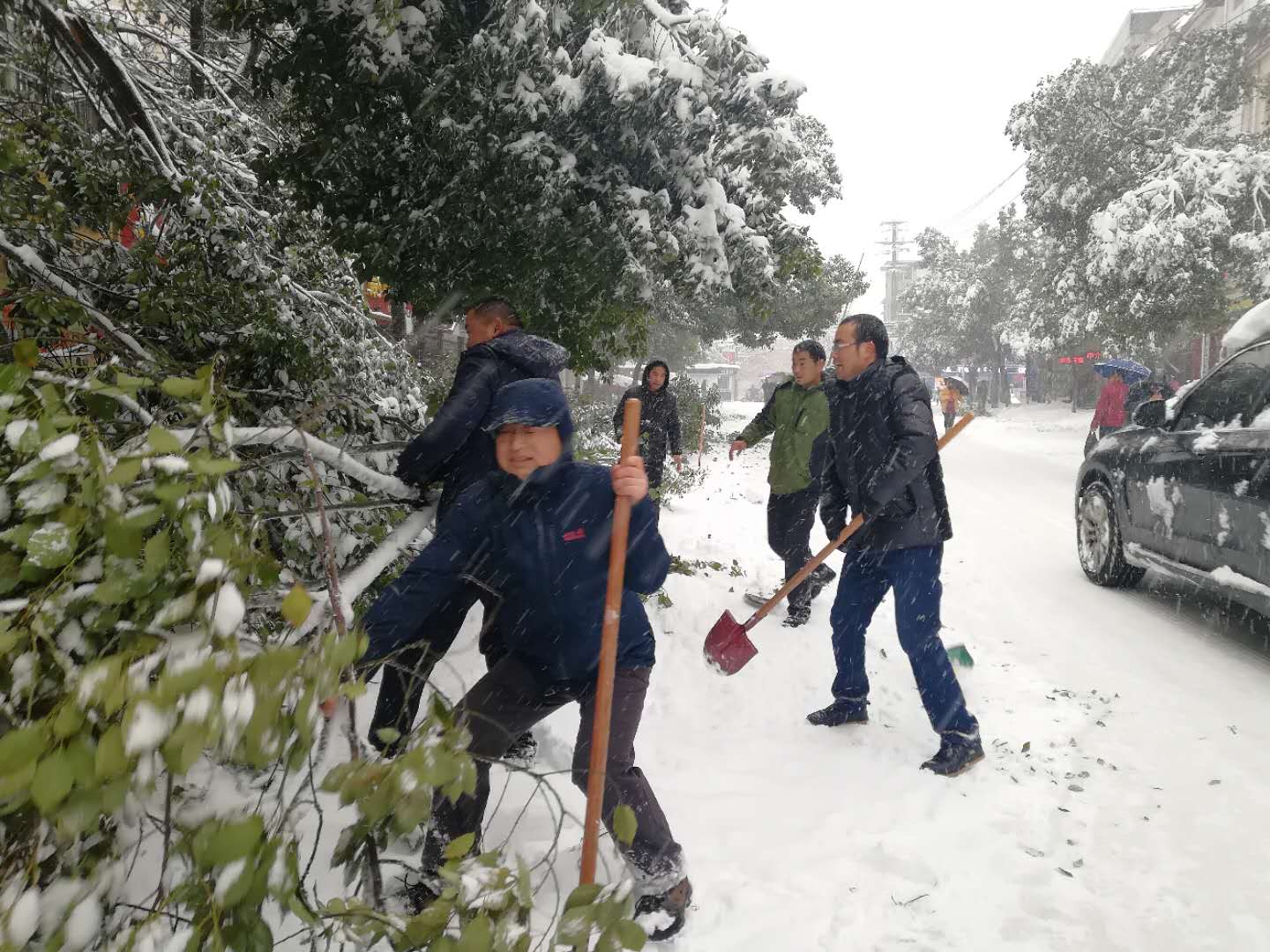 为了保护好市民的人身和财产安全,县园林所积极采取有效可行的措施,应对这一突发事件。4日早上一上班,在局领导带领下园林所全体人员冒着风雪及时扛上铁锹和竹竿走上街道清理护绿。一是利用竹竿拍打树枝上的积雪,在第一时间给这些行道树做好"减压"工作,为树枝减负,以防大雪继续压断树枝,尽最大努力保护好绿化成果。二是对阻碍人行道的断枝先进行清理,以便行人和车辆的通行,消除安全隐患。